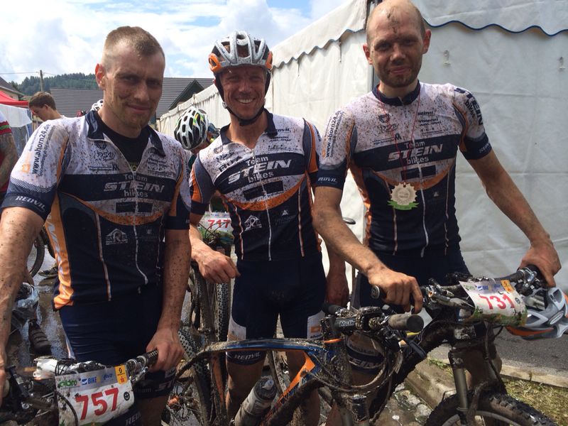In der Staffel kämpften die Herren Lasseck, Meyer und Stein gegen die Strecke und sich Selbst. Jeder hatte die Seiffener Schleife einmal zu umrunden, sodass in der Summe 100km auf der Uhr stehen sollten. Andre Meyer und Rico Lasseck hatten nach eigenen Worten gestern ein dickes Stück Kaugummi am Hinterrad kleben und wollten nicht so richtig vorwärts kommen. Von daher waren beide mit ihrer Leistung nicht vollständig zufrieden und geloben Besserung. Im völligen Gegensatz dazu stand Marcels Fahrt. Wie entfesselt umrundete er den Kurs und brannte eine Zeit in den Wald die am Ende den Sieg für die STEIN-bikes Staffel festhielt. Damit Platz ein und oberstes Treppchen für die Jungs!