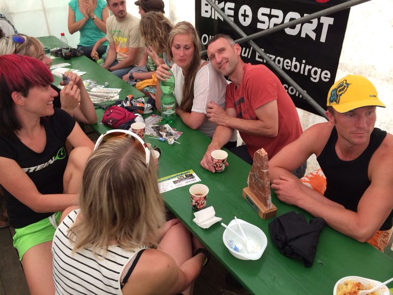 Für unsere Jungs und Mädels lief es richtig gut. Zwar konzentrierte sich die Stein'sche Aktivität auf die 70km Strecke und den Staffelwettbewerb, dafür ging's dort aber ordentlich zu Sache. Auf der mittleren Strecke kämpfte Dr. O in der Verfolgergruppe um eine gute Gesamtplatzierung mit und konnte trotz einsetzender Krämpfe einen hervorragenden sechsten Platz nach Chemnitz einfahren. In seiner Altersklasse schrammte er knapp am Treppchen vorbei und belegte dort den vierten Platz hinter dem Australier Ben Allen. Mit knapp vier Minuten Rückstand auf den Doktor rollte KaiRo über die Ziellinie. Leider hatte er in der neuen Abfahrtspassage Pech und musste einen Sturz wegstecken, der sein Vorderrad arg in Mitleidenschaft zog. Allerdings hatte er noch Glück im Unglück und konnte das Rennen zuende fahren. Er schrammte knapp an den Top Ten vorüber und wurde 11. in der Gesamtwertung (7.AK). Damit wird das Projekt: Seiffener Holzkunst halt im nächsten Jahr umgesetzt . Kurz hinter KaiRo platzierte sich Thomas Peschke auf dem 13. Platz (AK.8.) und komplettierte somit das gute Gesamtergebnis. Er blieb von Stürzen und Defekten verschont und war laut eigener Aussage mit seiner Leistung ebenfalls zufrieden. Thumbs up Jungs, für euren starken Einsatz!